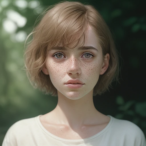 Detailed and realistic portrait of a woman with freckles, round eyes and short messy hair shot outside, wearing a white t shirt, skin texture, chapped lips, soft natural lighting, portrait photography, 85mm lens, magical photography, dramatic lighting, photo realism, ultra-detailed, intimate portrait composition, Cinestill 800T --testp --ar 9:16 --upbeta --