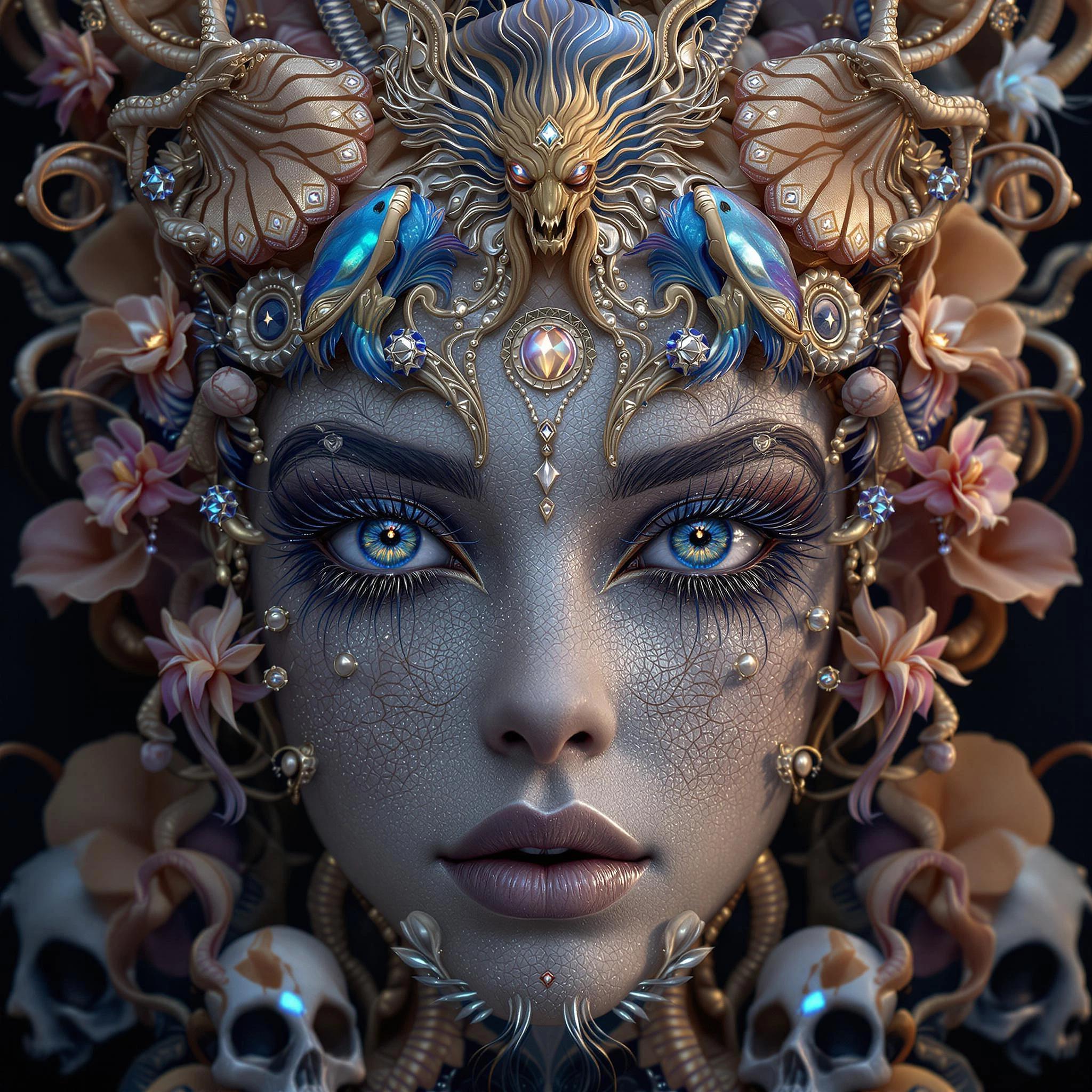 Goddess close-up portrait ribcagel. jellyfish phoenix head, nautilus, orchid, skull, betta fish, bioluminiscent creatures, intricate artwork . octane render, trending on artstation, t symmetrical artwork. cinematic, hyper realism, high detail, octane render, 8k
