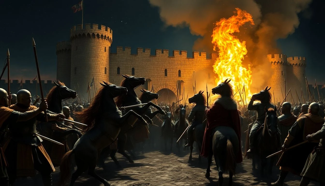 a medieval battle scene in front of a castle, with a large crowd of people and horses. The castle is made of stone and has several towers, with a large fire burning in front of it. The people are dressed in medieval clothing, with some wearing armor and others wearing tunics and cloaks. Some are on horseback, while others are on foot. The horses are rearing up on their hind legs, and some of the people are holding swords or other weapons. The background of the image is dark, with a few stars visible in the sky. The overall atmosphere of the image is one of chaos and violence, with the sound of clashing steel and the smell of smoke and sweat filling the air.
