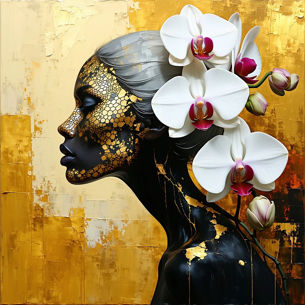 A minimalist and textured canvas with expressive brushstrokes captures a woman with an elongated neck and a face adorned with intricate golden and black honeycomb patterns, resembling a sleeping orchid. The artwork blends Art Nouveau and expressionist elements, characterized by grunge oil paint colors and a dreamlike quality, with a focus on realistic details and minimal stylization. Large white orchids with vibrant red centers decorate her silvery blonde hair and shoulders, set against an abstract background with warm mustard yellow and dark earthy tones. --ar 3:4