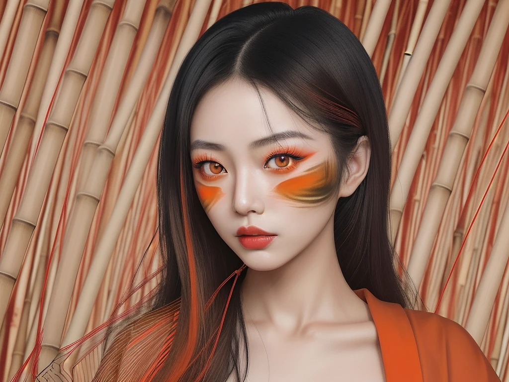 A drawing portrayal of a Japanese woman's face with red eyeshadow, depicted in bold, colorful lines of dark beige and orange, crafted from wire with flawless, chaotic linework, creating captivating, raw, and edgy portraits against a bamboo background.