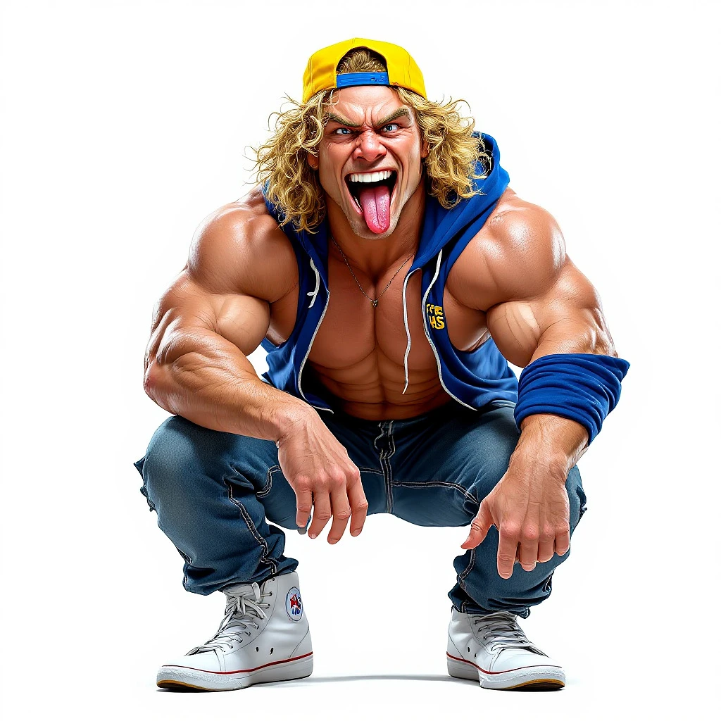 Hyper realistic, College wrestler, chiseled jaw, round face, smirking, curly blonde shoulder length hair, muscular, high top white shoes, jeans, blue FHS hoodie, flat bill backwards yellow hat, tongue out, full body shot
