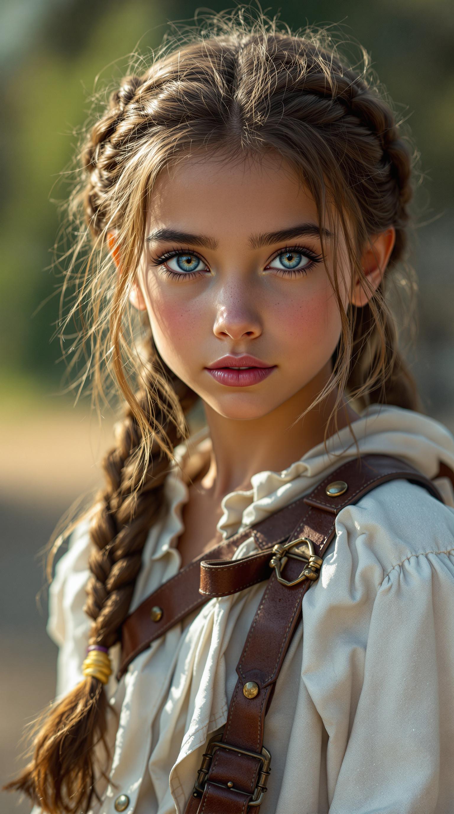 a professional photo of a exceptionally beautiful girl in the world (age 9), (nine year old), highly detailed, futuristic, (futuristic), (masterpiece), (realistic), (perfect anatomy), (Full body from head to knees), (facing the viewer) with long Chocolate Brown with a French Braid, with Sandy Golden Blonde eye brows, beautiful olive skin, thick black eye liner, extra long eye lashes, light pink blush, extremely beautifully shaped lips with light pink lipstick, dark blue eye shadow, perfectly flawless skin, beautiful perfect high cheekbones beautiful perfect high cheekbones extremely detailed large perfectly shaped beautiful brilliant Forest Tea, grey, blue green, hazel, amber, brown, bedroom eyes, beautifully manicured long fingernail with red polish, dressed in time period of Davey Crocket, with a , with a musket riffle strapped to her back, o a dirt road with the Alimo the background, with a dreamy expression on her face, 8k, (high res), ultra-detailed, photo-realistic, full image view, full body view, front view, highly detailed, volumetric, dramatic lighting