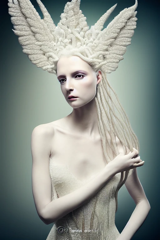 Portrait of a beautiful queen-roots-angel, long elegant intricate ornamental roots white dress, porcelain skin tone, clear eyes, intricate expansive mandelbrot! ! ! set fractal hair ornament! ! ! , elegant, ornate! ! roots ornament hair, realistic, refined, natural lighting colors, high quality, fine art photo by Flora Borsi, volumetric lighting, 8k