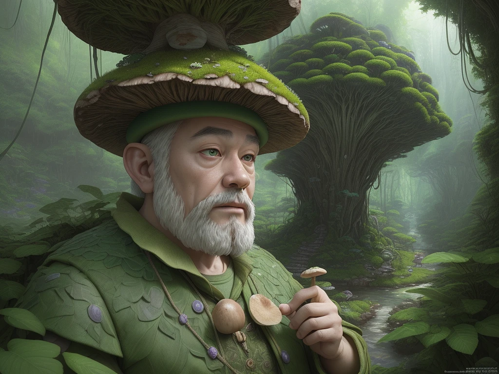 man human like mushroom gnome, intricate, realistic face, detailed portrait, detailed face, green outfit, insanely detailed, vivid color, trending on artstation, 4k, hyper realistic, focused, extreme details, cinematic, masterpiece, concept art by Katsuhiro Otomo and real studio ghibli, amidst the lost valley, rock arcs, lush vegetation, exotic forrest and plants, fly agaric mushrooms, landscape, alex ross, eddie mendoza, raphael lacoste, sebastian ludke, concept art, matte painting, highly detailed, rule of thirds, dynamic lighting, cinematic, detailed, magnificiant landscape, denoised, centerd