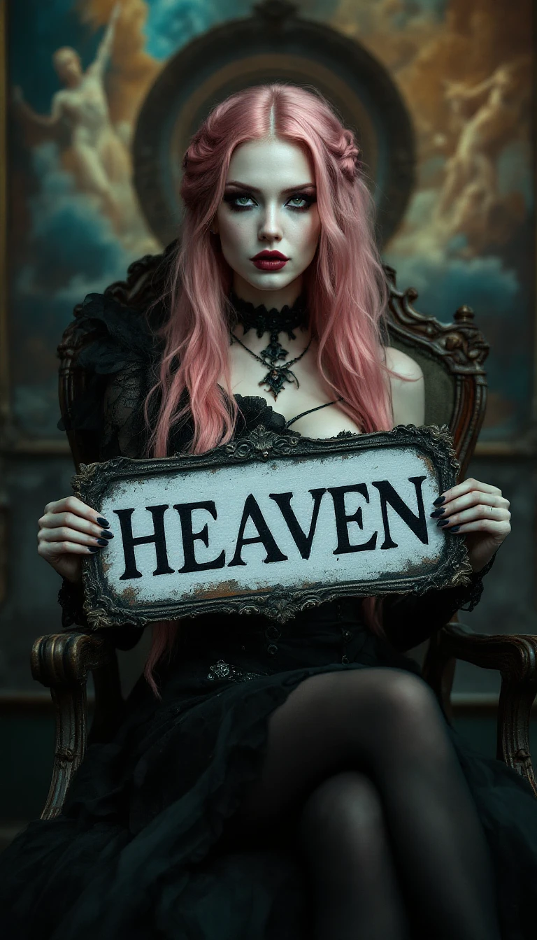 A gothic woman with long pink hair is seated on a vintage chair, holding a sign that says "HEAVEN" in big bold text, against a heaven scene background.