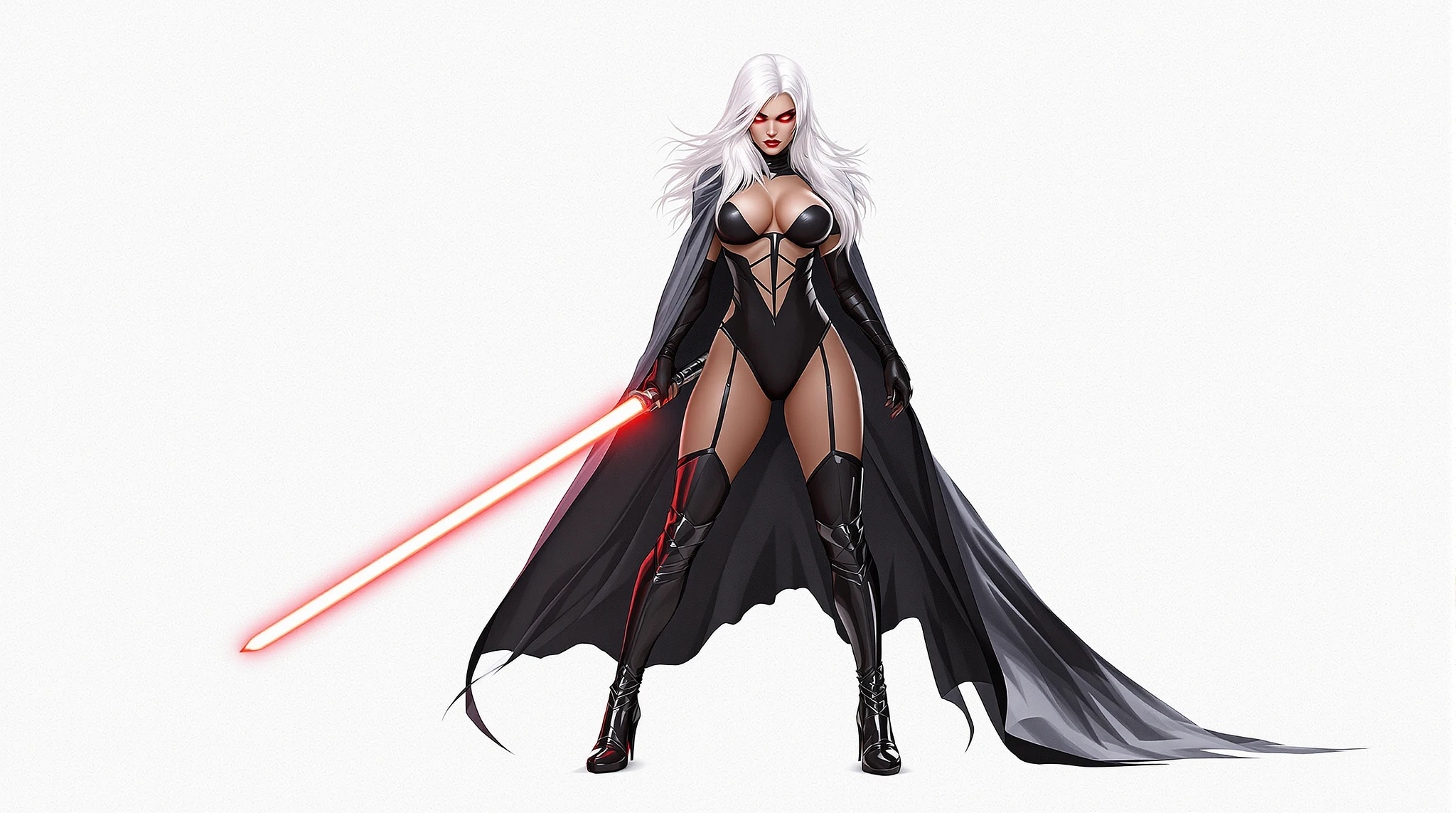 Woman, tall, voluptuous, full breasts, long white hair, Sith lord, cinematic, photo realistic, one piece black leotard, black stiletto boots up to the knees, red glowing eyes, she stands ready to attack with a red light saber in her left hand, black cape, angry, extreme wide full body view from head to toe, casts shadow, transparent background