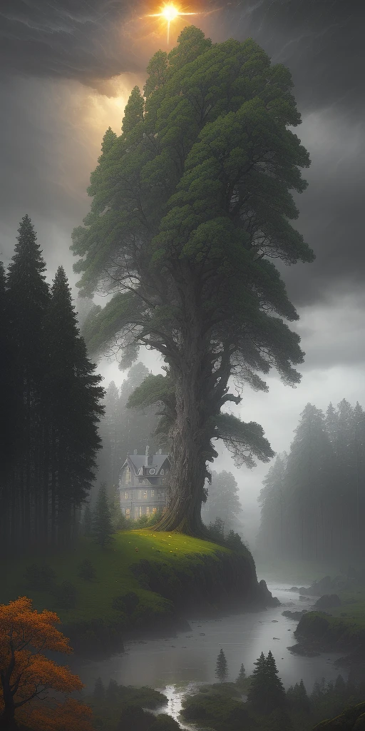landscape in Brittany, surrounded by trees, sun, foggy, massive storm clouds, Ivan Shishkin, Victo Ngai, Gregorio Catarino, Cyril Rolando, Michal Karcz, Anato Finnstark, Flavio Greco Paglia, hyper-detailed defined oil painting, vibrant colors, 8K resolution, polished divine photo-realistic intricate complex HDR, amber glow, dreamy Pino Daeni and Jacek Yerka, professional, extremely detailed cinematic lighting poster award winning