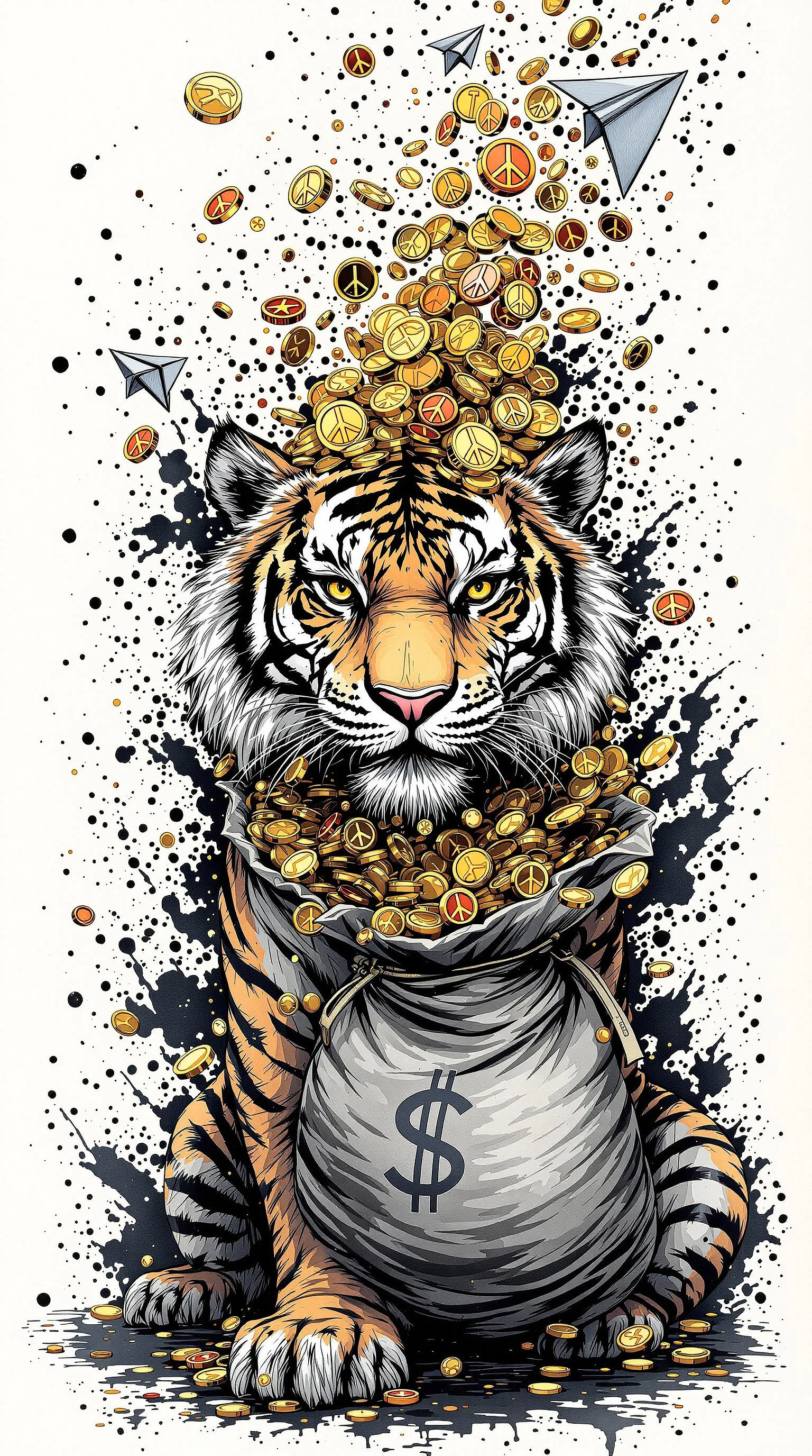 There is gold, copper coins, peace charms, and paper airplanes floating around a tiger,Coins, A money bag overflowing. , paper airplane, detailed, full-body shots, ink style, Ink splash art on the background, ink style, The whole is on the right,Ink wraps around the body, and the ink obscures the subject, Colored