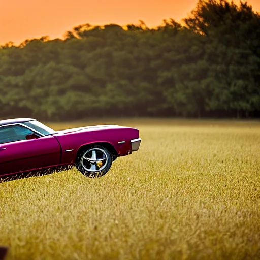 car wreck, muscle car, in a field at sunset, figure walking away from car, figure on the ground