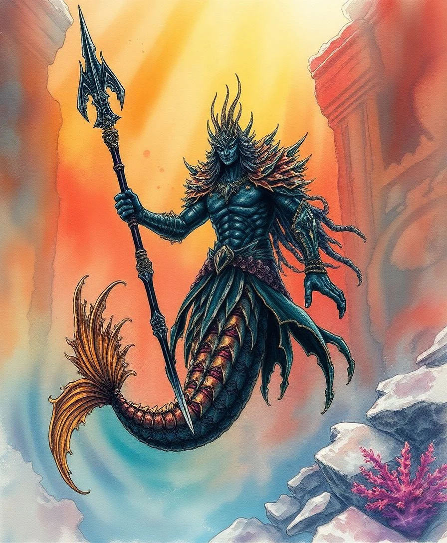 watercolor ink wash illustration featuring, bold rich underwater coral gradients and colors The overall color palette is warm and vibrant, with deep shadows and a tropical reef tones, enhancing the dramatic and underwater feel of the scene. in the art style of Wylde Airt and Brian Froud. Sunken underwater Atlantean ruins Water-Crystal Atlantean Merman, Necromantic Crystal Warrior-Mage Full-length, illustration, shattered water-crystal shards, fully clothed in protective polished black and lucent gold scaled armor, creative dynamic fight poses, Dark Necro Daedric influence, pearlescent overlay, watercolor palette tones, acrylic texture pour, Brian Froud Heather Theurer fantasy art, perfection, perfect anatomically correct form, pen and ink finely detailed outline, detailed illustration, concept fantasy art design by (("wyldeairt") ). The color palette is dominated by underwater coral hues, blues, ruby emerald golds, enhancing the futuristic and aquatic theme. brilliant detail, fine animation perfectly executed