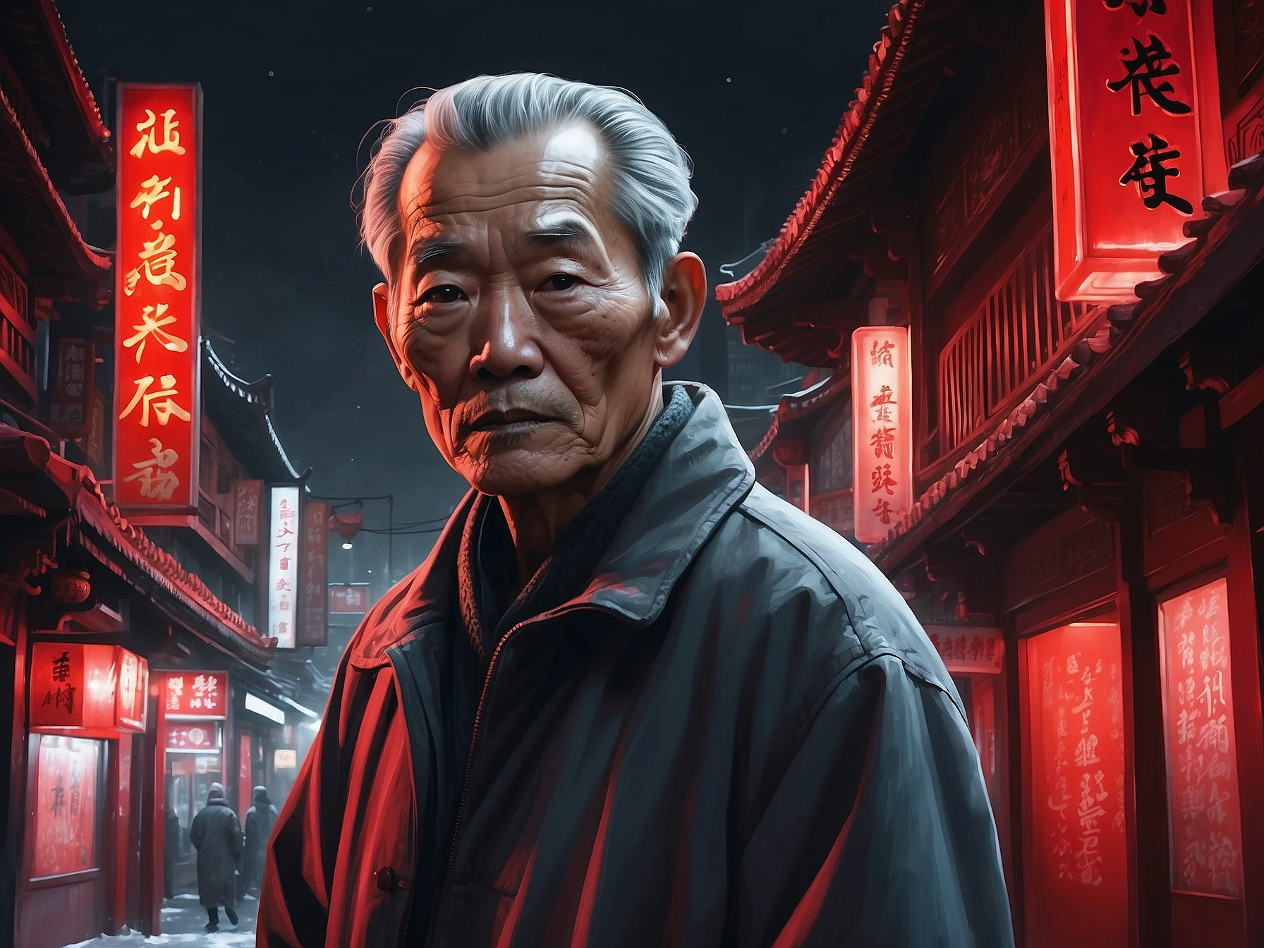 a man standing in front of a red lit building, a digital painting by Ryan Yee, cgsociety contest winner, photorealism, digital painting, detailed painting, digital illustration