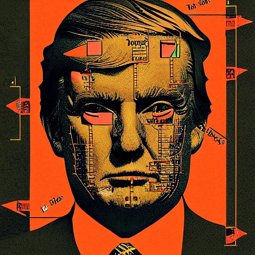 self portrait trump, infographic, chart, data visualisation artwork, schematics, diagram, measurements, marginalia, abstract, filigree, scientific, intricate, typography, eyes on portrait face, 8k, surreal