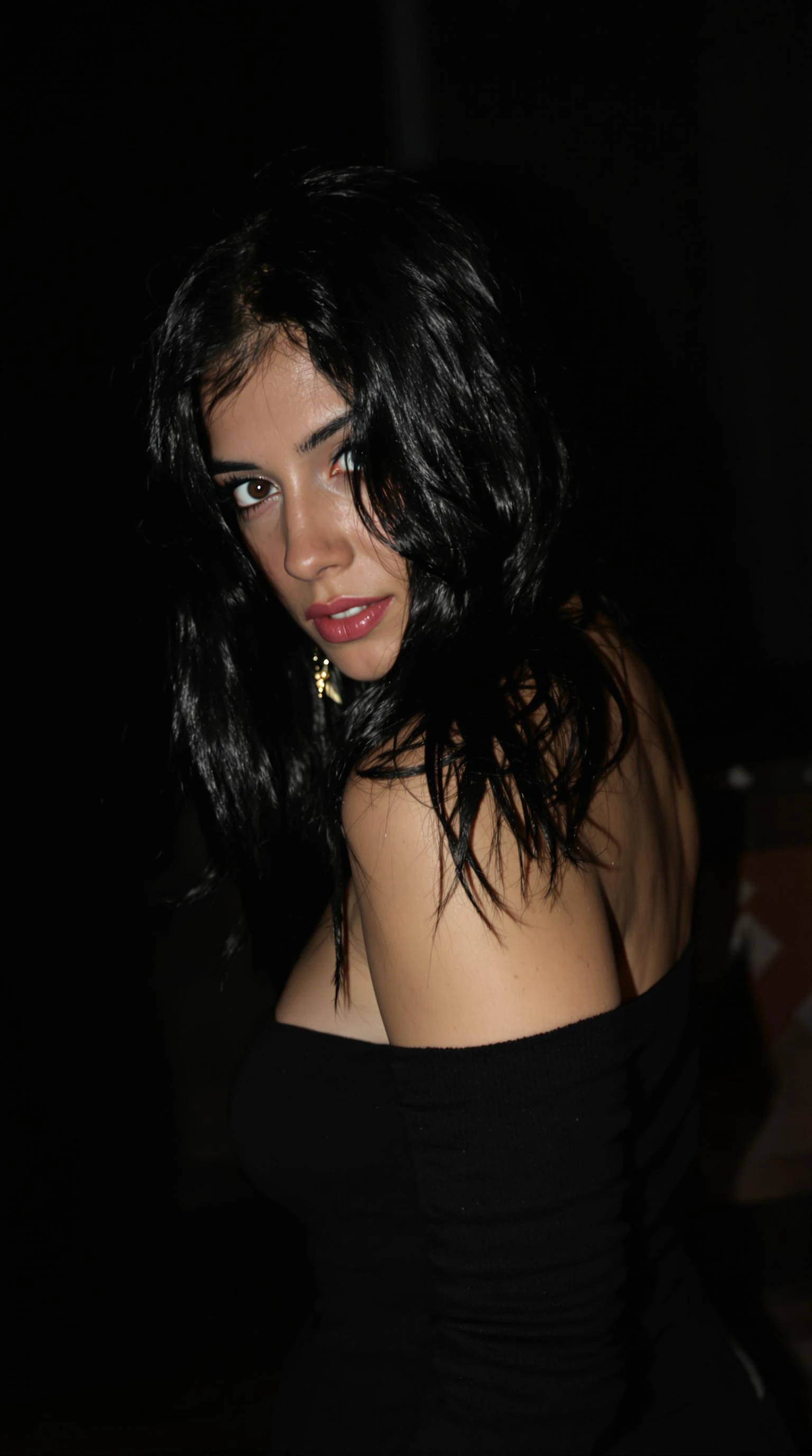 18-year-old woman, black hair, light blue eyes, tanned white skin, thin body, wearing black clothes and light makeup. She is in a dimly lit room, posing.