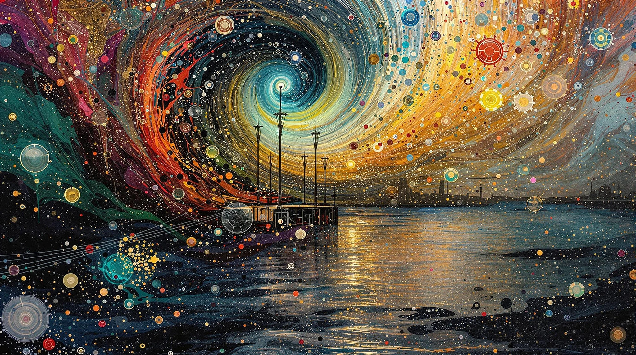 Steampunk bio-morphic ethereal glow. Acrylic splash art, opaline pearlescent ink, translucent glaze. Anthropomorphic Steampunk biomorphic Australian Dreamtime Dot art, hyper textured, spiral fractals concentric circles. A dazzlingly chaotic Digital artwork with intricate details, including dark colors and flawless gradients in precise Pantone shades. rich fabrics in deep reds and greens add movement. More than technique, this exhibition captures emotion, resilience, and presence, honoring the timeless beauty of the human experience through light and shadow. Gritty dark docks in the background