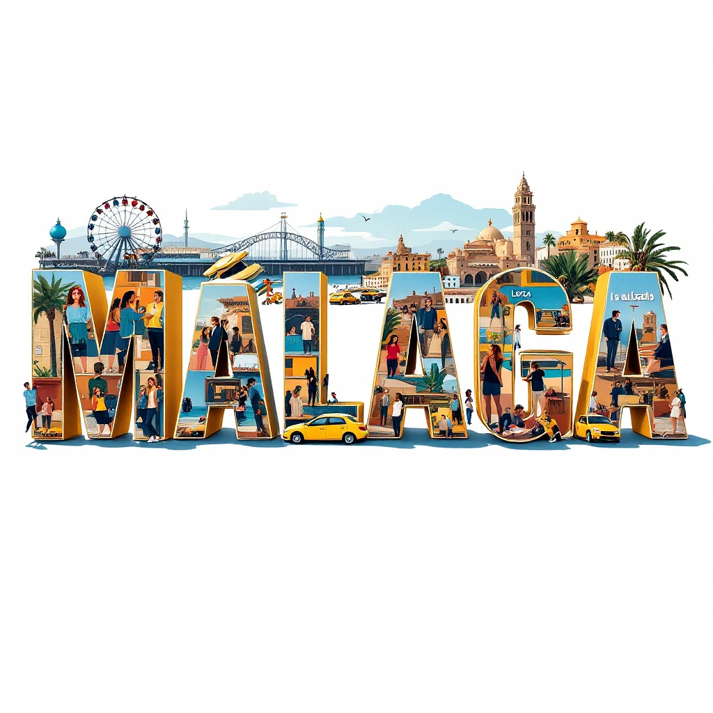 A striking, high-contrast cinematic photo-style vertical collage that captures the essence of Málaga Each letter of 'Málaga’ is represented by a dynamic and vibrant scene, with different iconic landmarks and moments in time. The Santa Monica Pier and la alcazaba Sign dominate the background, while smaller scenes like bustling street life, yellow cabs, and people in various activities fill the foreground. The overall mood is energetic and lively, with an emphasis on the city's vibrant spirit. The typography is bold and eye-catching, making the collage a stunning visual representation of Málaga, . poster, vibrant, photo, typography, conceptual art, 3d render, cinematic, illustration