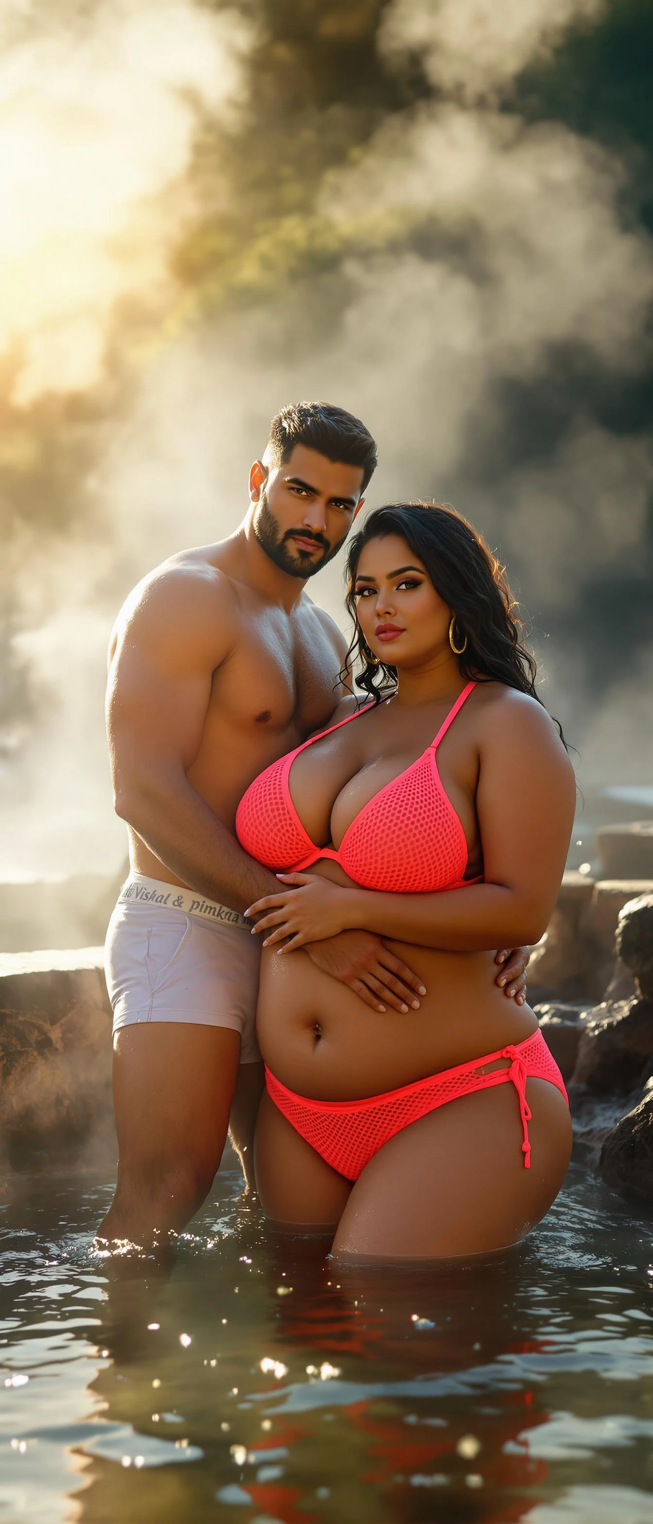 The golden afternoon sun beams through the swirling mist of the steamy hot spring, casting a warm glow over their dripping wet, sculpted bodies. The natural thermal waters bubble around them, their intimate embrace radiating heat even hotter than the springs themselves. She stands proud, bold, and breathtakingly voluptuous—a thick, ultra-curvy XL Indian goddess with massive, round, ultra-firm J-cup breasts barely contained in her soaked neon coral Vishal & Pinkie mesh bikini. The branded straps dig into her plush shoulders, gripping onto her full, heavy curves as if they can barely handle the weight of her lush, bountiful colossal chest. Her flat stomach curves into tight waist , her hips impossibly wide, her ass truly colossal—huge, round, and standing out in all its full, ultra-thick glory. The ultra-low-rise G-string disappears between her massive, muscular yet soft curves, leaving only the bold Vishal & Pinkie logo across her waistband as a reminder of the brand's confidence. Her lean built, smart, handsome, tall, athletic, muscular, husband towers beside her, gripping her soaked waist, his tight, white, see-through Vishal & Pinkie briefs clinging to his powerful form with a front huge bulge in briefs. His sharp, handsome face is clean-shaven, his muscular arms flexing as he pulls her against his solid frame. They both hold frosty beer bottles, droplets rolling down the glass, a contrast to the intense body heat radiating between them. She arches her back slightly, proudly pushing her enormous bust forward, her thick thighs pressing against his as they look directly at the camera—a statement of power, seduction, and unapologetic allure. His lean body compliments her curvy full body. The rising steam, the lush greenery, the wild beauty of the hot spring—all of it fades behind the sheer raw confidence and magnetism of the couple. This isn’t just a moment; it’s a celebration of beauty, and passion—Vishal & Pinkie’s boldest statement yet.