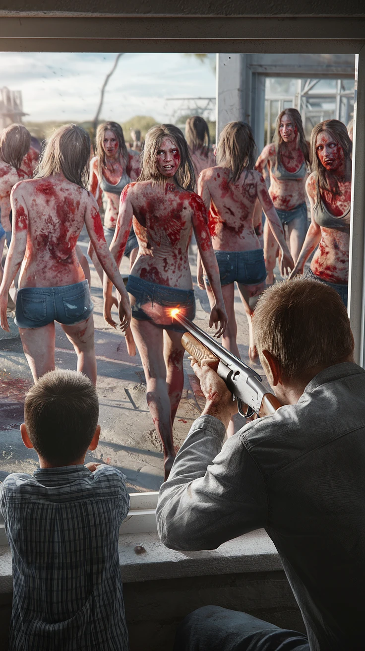 A boy and his dad looking from a window at daylight and sees many walking womem zombies . Their body are exposed and covered with blood . The dad holds a shotgun and shooting shots at them . Hyperrealistic. Hyper details . Hyper face and body details . 8k . High quality .