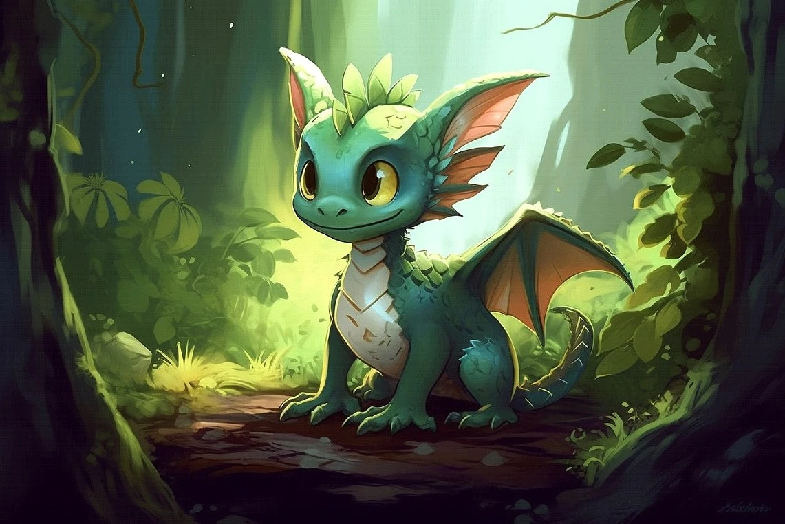 character concept, cute baby dragon in the woods, dungeon and dragons, fantasy, medieval --v 5 --ar 3:2