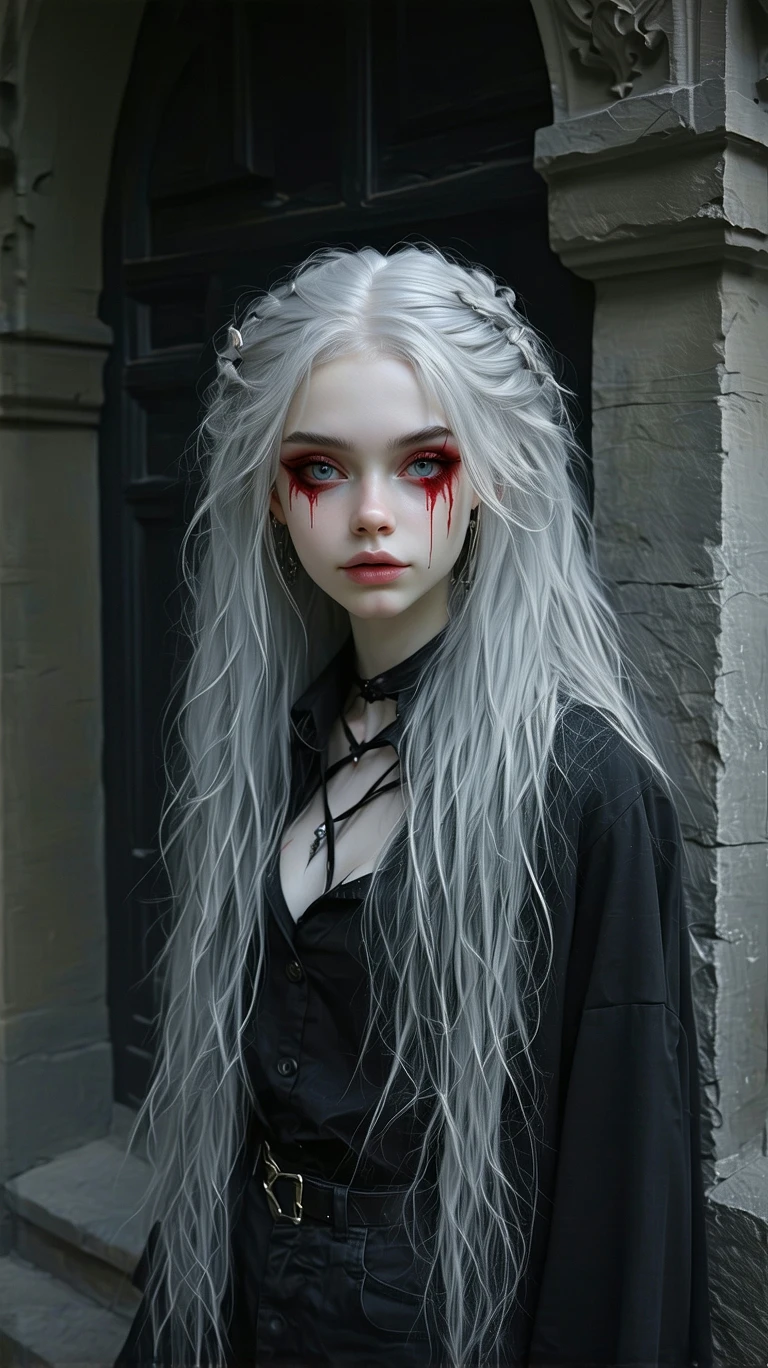 A photo-realistic image of a tween vampire, with visible bit mark on neck, with super long grey hair, she is very beautiful with white skin and deep blue eyes, she has red eyeliner, red lipstick, and her clothes and personal style are from the gothic culture <lora:midjourney_whisper_flux_lora_v01:1> Steps: 20, Sampler: Euler, Schedule type: Simple, CFG scale: 1, Distilled CFG Scale: 3. 5, Seed: 2496298376, Size: 896x1152, Model hash: d3532ec6fd, Model: flux1DevV1V2Flux1_flux1DevBNBNF4V2, Lora hashes: "midjourney_whisper_flux_lora_v01: ee64e90efc4d", Version: f2. 0. 1v1. 10. 1-previous-501-g668e87f9, Module 1: t5xxl_fp16, Module 2: clip_l