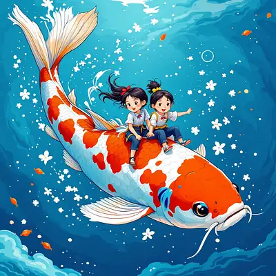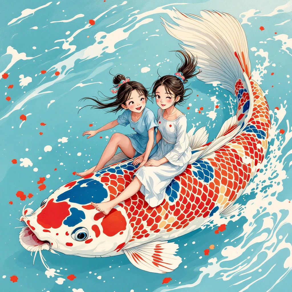 a cartoon of a two girls riding a koi fish, in the style of he jiaying, comic/cartoon, ocean academia, cartoon mis-en-scene, fang lijun, sky-blue and red --niji 5