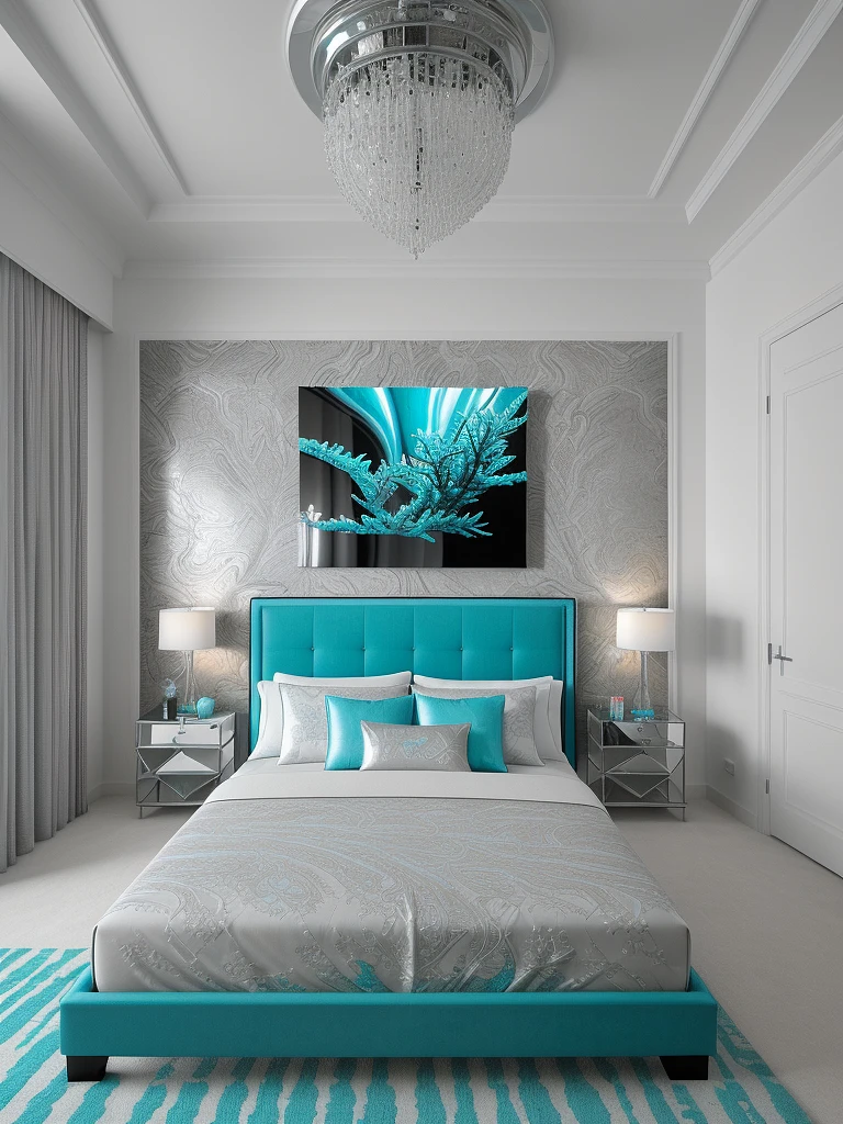Ultra high detailed photo of turquoise Aquarium Bed in a white interior luxury bedroom, silver strokes --ar 4:7