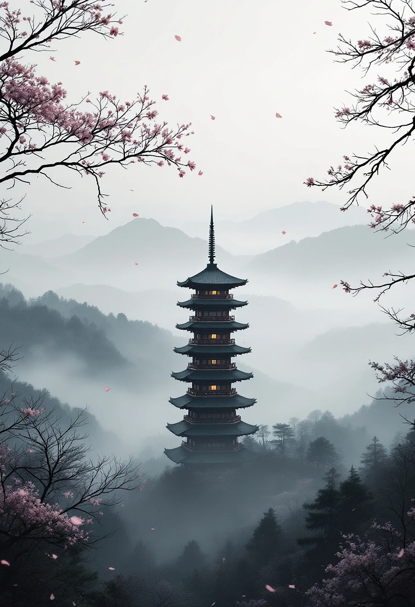 Traditional Japanese pagoda standing tall in a foggy mountain valley, centered mid-range view. Dense mist surrounds the base and rolls through the distant layered hills. Entire scene rendered in monochrome grayscale tones with no color grading, no blue skies. Include a clearly visible yet subtle, muted warm light gently illuminating the interior of the pagoda, softly diffused through the windows or openings to bring a quiet sense of life and presence. Soft pink petals drifting in the air, extremely minimal, serving only as soft atmospheric accents. Bare branches subtly frame the scene on the sides—no full cherry blossom trees, and no foliage obscuring the pagoda. Moody ink-wash aesthetic, inspired by Ghost of Tsushima, cinematic yet understated. High detail in pagoda structure, gentle shadows, calm, and mysterious tone. Minimalist, peaceful composition with deep atmosphere and silence.