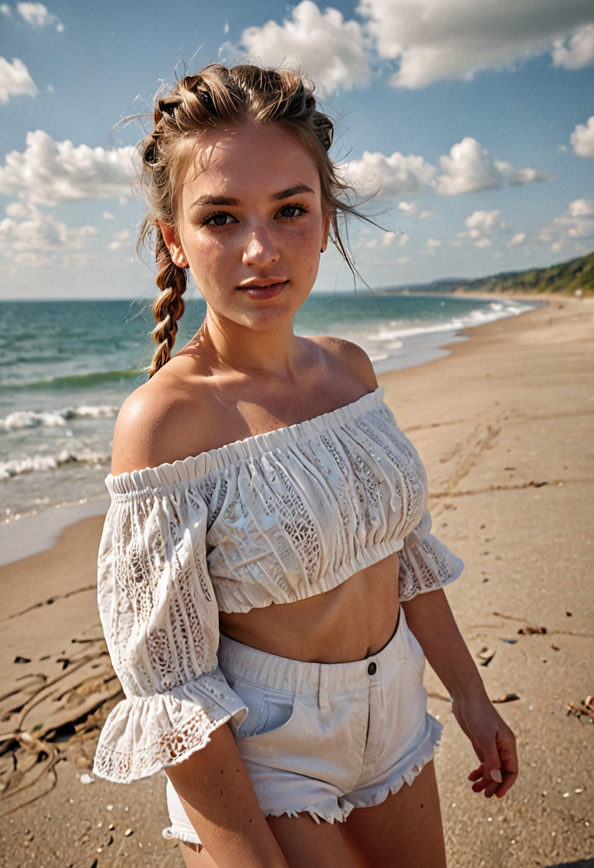 photograph of a 28 year old busty woman with plait hair, dressed in white off-shoulder crop top, white shorts, textured fabric, ruffled sleeves, bright sunny partly cloudy sky, walking along a beach, (intricate details:1.12), HDR, (intricate details, hyperdetailed:1.15), (detailed face:1.3), (high angle:1.4)