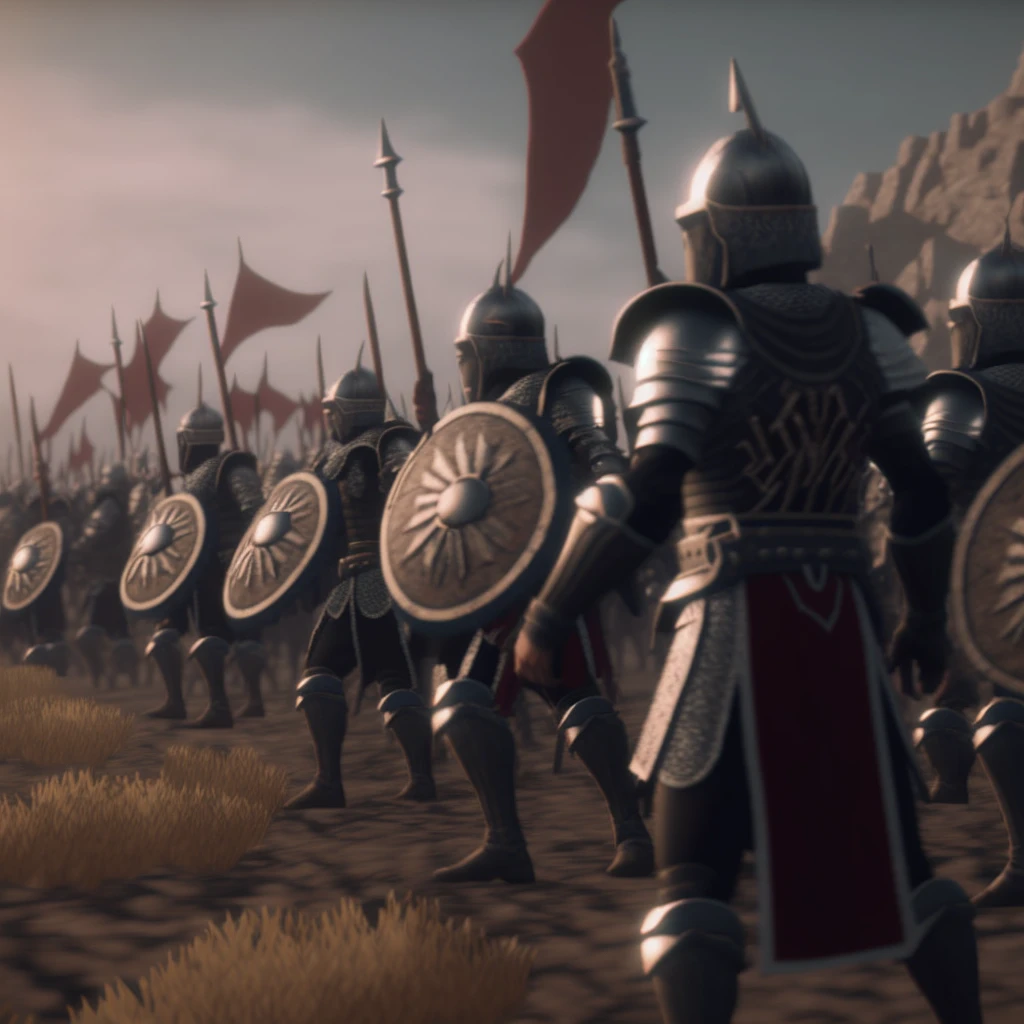 medieval army with black armor and red turbans moves across a plain, photoreal, studio photography, 8k, unreal engine 5, full realistic, landscape, high details, octane render, cryengine, volumetric lighting, cinematic, mood, dust, particles, particle effect, atmosphere, ray tracing, uhd, lighting rendered in Unreal Engine 5 and Cinema4k, Diffraction Grating, Ray Tracing Ambient Occlusion, Antialiasing, GLSL-Shaders, Post Process, Post Production, Cell Shading, Tone Mapping --v 4