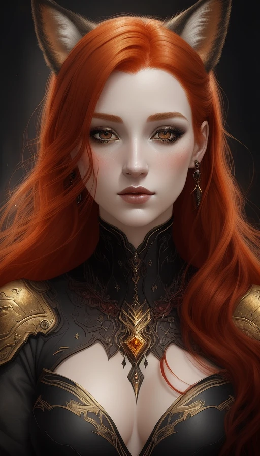 an art piece of a fantasy woman with red hair, in the style of realistic, fawncore, black and amber, varied brushwork techniques, distinctive noses, dark white and light gold, i can't believe how beautiful this is