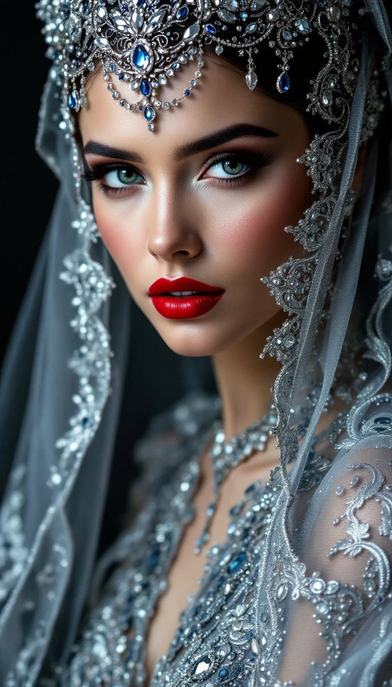 strikingly beautiful woman with piercing eyes, wearing an intricately designed silver and black gown with delicate embroidery. Her elegant veil flows around her face, adorned with shimmering gemstones and ornate filigree patterns. A detailed headpiece encrusted with sapphire-like jewels enhances her regal aura. The fabric of her dress reflects a metallic sheen, giving it a luxurious and ethereal appearance. The lighting is dramatic, emphasizing her high cheekbones and bold red lips against a dark background