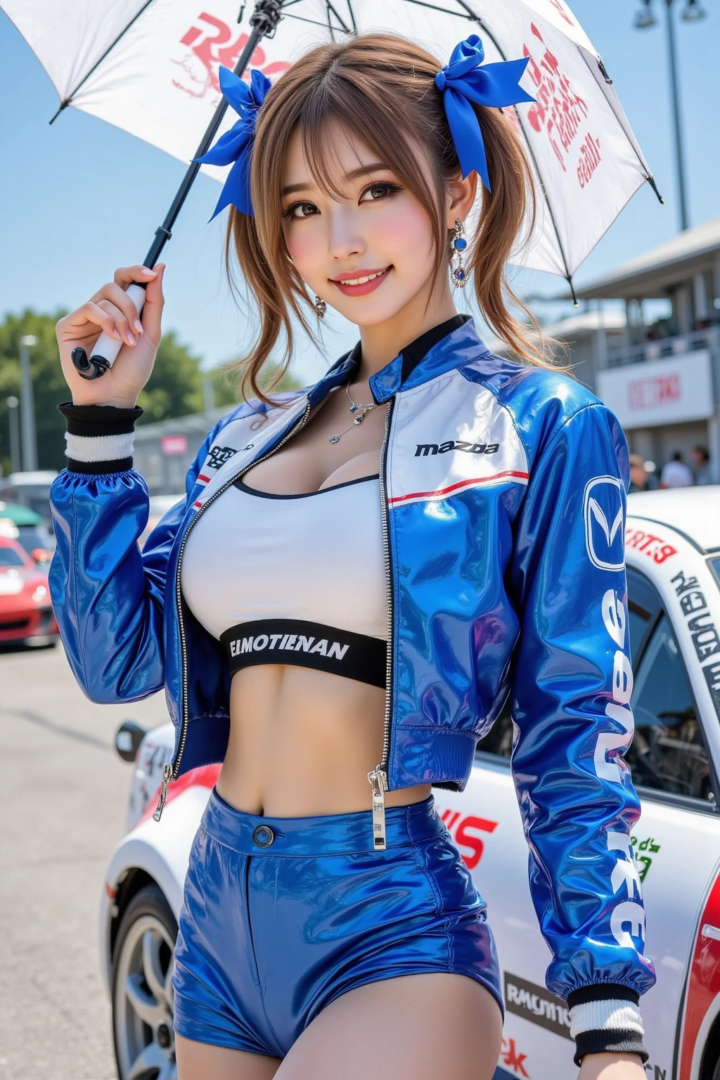 Create an ultra-detailed, vibrant, and photorealistic portrait of a stunningly beautiful young East Asian woman, styled as a charismatic "race queen" or "grid girl" at a professional motorsport event. Overall Style & Mood: Aesthetic: The image should look like a high-energy, polished professional photograph from a live racing event, suitable for a major brand's advertising campaign or a motorsport publication. Tone: The mood is bright, cheerful, and confident, capturing the excitement of a sunny race day. Subject & Appearance: Model: A real-life model in her late teens or early 20s with a flawless, porcelain complexion and a gentle, friendly smile. Hair: She has very long, silver-white hair styled into elegant, wavy twin ponytails. Hair Accessories (Crucial Detail) : Each ponytail is tied with a distinct hair accessory: a stylized, wing-like bow made from a royal blue satin fabric, held in place with a black ribbon. Eyes: She has striking, beautiful violet or amethyst-colored eyes (achieved with high-quality contact lenses) , which are a key feature. Ultra-Detailed Realistic Outfit: Theme: A sleek, coordinated, and futuristic race queen uniform with a royal blue, white, and black color scheme. Jacket: A cropped, long-sleeved bolero jacket worn open. Material (Key Detail) : The jacket is made from a high-shine, crinkled royal blue vinyl (PVC) material that creates sharp, realistic reflections. Details: It features a high collar, black cuffs, and sponsor logos realistically printed in white on the sleeves. Crop Top: A white sports-style crop top worn underneath. Material: A matte-finish, high-quality performance fabric (like cotton/spandex) . Details: It has black side panels and a realistic red and black racing team logo printed on the chest. Mini Skirt: A very short, form-fitting micro-mini skirt. Material: Must match the jacket: high-shine royal blue vinyl (PVC) . Details: It has a thin, simple black waistband. Thigh-Highs: She wears matching high-shine royal blue vinyl thigh-high boot covers or stockings with a simple black band at the top. Prop & Environment: Prop: She is holding a large, professional-grade racing umbrella with a black pole. The umbrella's canopy is white and royal blue, featuring sponsor logos. Race Car: She is leaning against a hyperrealistic white sports car (like a Mazda MX-5 Cup car or Honda Civic Type R TCR) . The car is detailed with bold, royal blue racing stripes and authentic sponsor decals on the hood and sides. Setting: The scene is the pit lane or starting grid of a professional racetrack on a bright, sunny day. The background, while slightly out of focus, shows details like the grandstands, other race cars, and the asphalt track. Lighting & Photography Style: Lighting: The scene is illuminated by bright, clear, direct sunlight. Professional fill flash is used to soften shadows on the model, creating a clean, commercial look. The lighting must produce sharp, specular highlights on the glossy vinyl outfit and the car's paintwork. Focus & Depth of Field: The photograph is shot with a shallow depth of field (emulating a professional DSLR with a prime lens) . The focus is tack-sharp on the woman's face and eyes. Resolution: Render in 8K to capture every photorealistic detail, from the reflections in the vinyl to the individual strands of her silver hair and the texture of the car's surface.