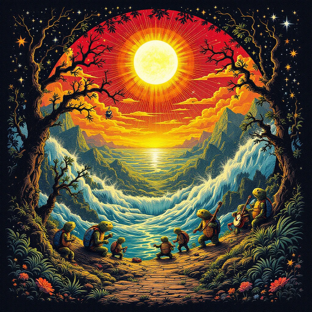 create an iconic Grateful Dead image using these song lyrics using their artwork and logos “Don't waste your breath to save your face When you have done your best And even more is asked of you Fate will decide the rest All the stars are gone but one Morning breaks here comes the sun Cross the sky now sinking fast Show me something built to last” including the steal your face logo, dancing skeletons, dancing bears, and the terrapin turtles playing the banjo and the tambourine