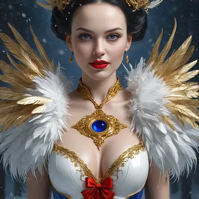 acid lighting, from below, hyperdetailed, hyper realistic, epic action full body portrait Incredible beautiful of Snow white with the merger between gold and fire, hypnotic opinion, fractal hair and feathers, detailed face | DamShelma | Bayard Wu, Ognjen Sporin, Yann Dalon, Toni Infante, Amr Elshamy, Viktor Miller-Gausa inquisitive soul | inspiration | gold and royal blue colors, intricate detailing, surrealism, fractal details, enigmatic flirty smile, red ribbon, view from back, dressed in complex chaotic classic outfit, breasts exposed, artificial nightmares style, reflective eyes, detailed eyes, detailed art deco ornamentation, 32k