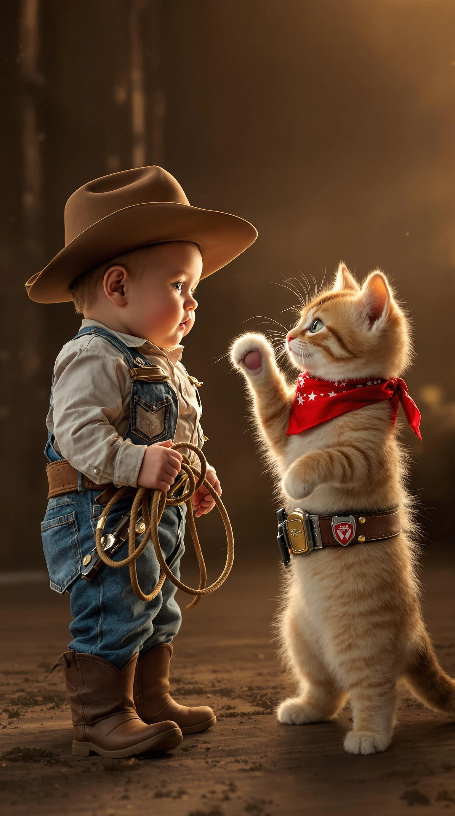 A hyper-realistic image of a baby cowboy and a cat dressed as a wild west outlaw, engaged in a playful standoff; the baby wears a cowboy hat, denim jeans, and boots, holding a small lasso; the kitten stands on hind legs, wearing a red bandana and a tiny cowboy belt with a toy holster, raising a paw as if about to duel; the background is a rustic barn setting with warm golden lighting and dust floating in the air; ultra-detailed, cinematic composition, 4K