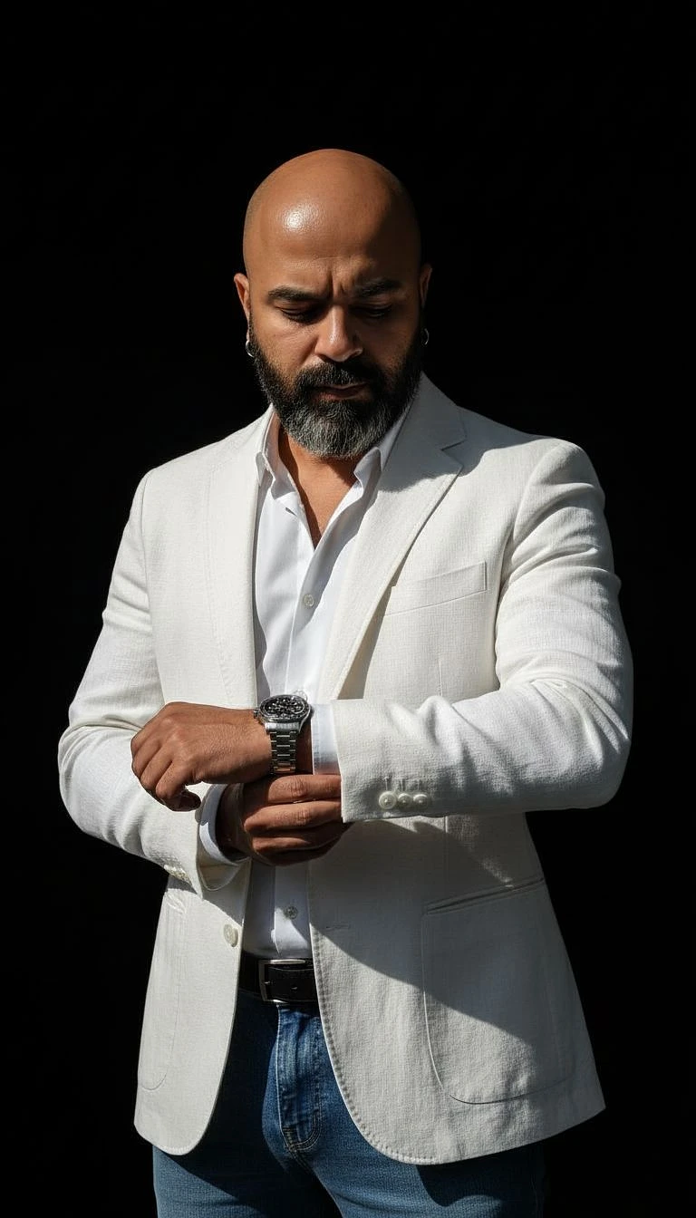A striking cinematic portrait of a stylish young man with a lean, toned physique (around 57 kg, 5'6 tall) — his beard remains unchanged, and his head is clean-shaven, giving him a modern, confident bald look. He wears one small, silver hoop earring in each ear, adding a subtle yet refined touch of individuality and style. a powerful, enigmatic man in a tailored white linen blazer, standing confidently against a deep black void background. exuding intensity and sophistication. His muscular build is subtly emphasized by the fitted blazer, with a crisp white dress shirt with blue jeans. He adjusts a luxury wristwatch on his left wrist with deliberate focus, his right hand poised near his cuff. Dramatic low-key lighting casts sharp shadows, highlighting the texture of the fabric, the gleam of the watch, and the contours of his face. Shot from a straight-on, slightly low angle to convey authority and dominance. Style: hyper-realistic fashion photography, high contrast, moody and minimalist, inspired by film noir and luxury menswear editorials, 8K resolution, razor-sharp details on suit stitching, beard hairs, and metallic watch reflections.