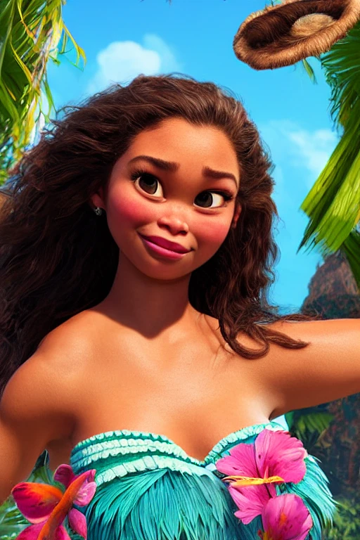 Princess Moana, realistic face, anatomically correct body, beautiful face, 8k, art by irakli nadar, hyperrealism, hyperdetailed, ultra realistic, VRAY, HDR, volumetric lighting