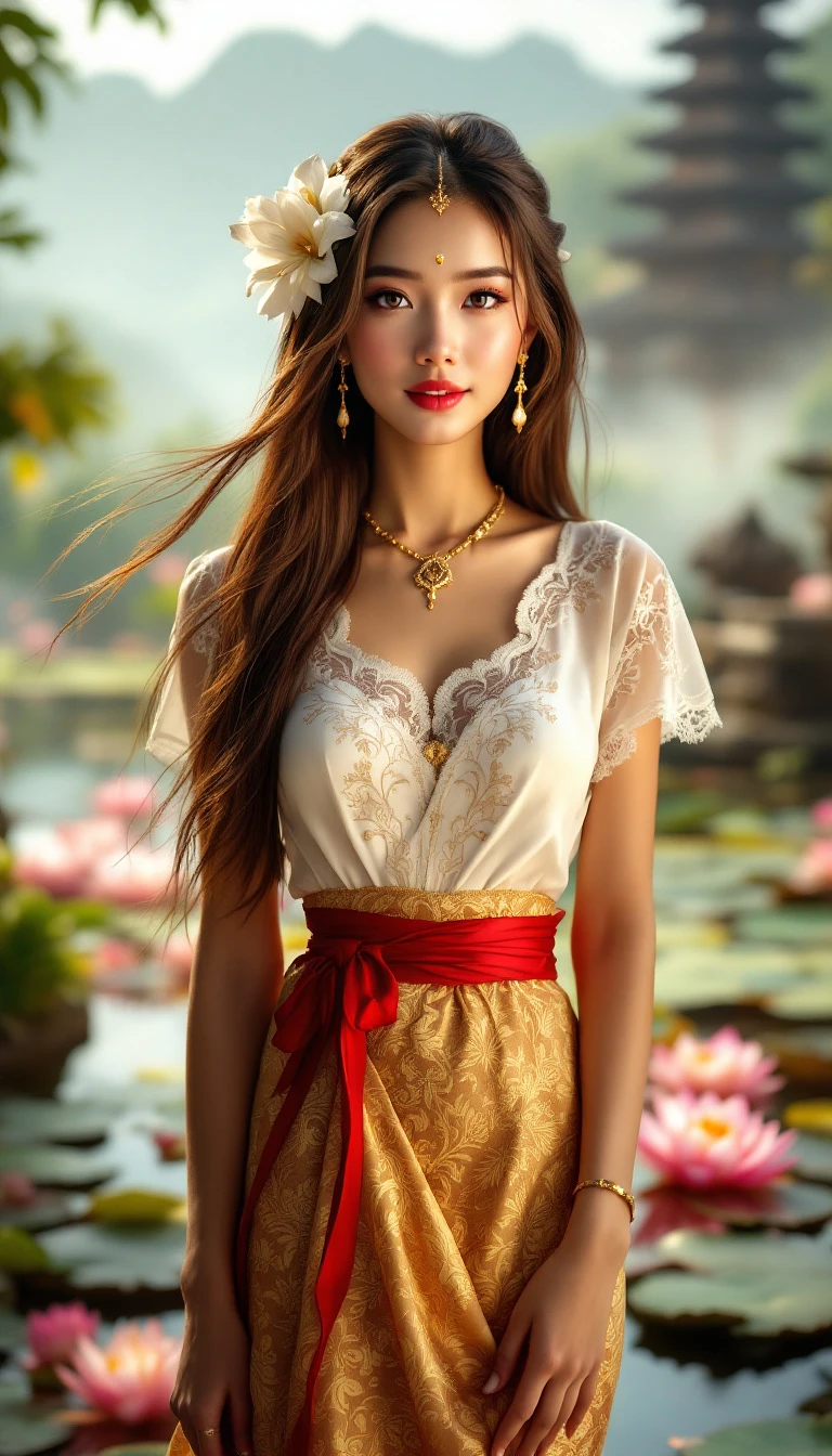 A stunning young woman with long, flowing brown hair adorned with white tropical flowers, standing gracefully near a Balinese temple complex. She wears a traditional Balinese kebaya with delicate white lace sleeves, a fitted white and gold corset, and a batik sarong with intricate golden-brown patterns, cinched at the waist with a red sash. Her elegant jewelry includes gold earrings, a matching necklace, and a decorative forehead accessory. The background features an authentic Balinese landscape with a serene temple by the water, lotus flowers floating on the surface, and distant mountains covered in mist. The warm sunlight bathes the scene, creating a realistic and vibrant cultural ambiance