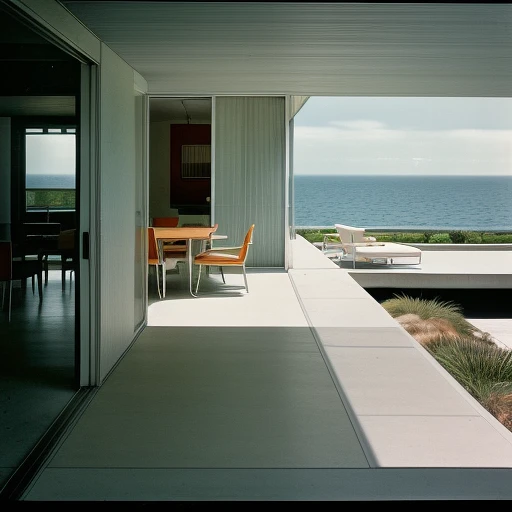 Hyper realistic eye level exterior photo of a mid century modern style house overlooking the ocean, daylight, indirect lighting, AD magazine, Frank Lloyd, Eames, Mies van der Rohe