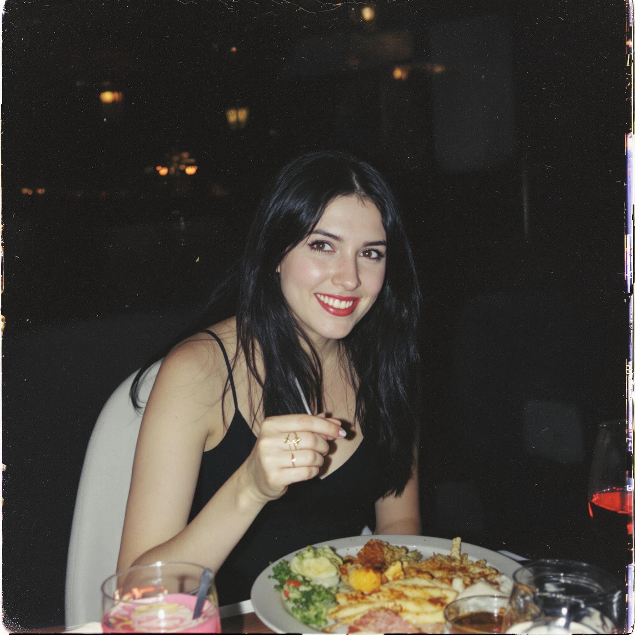18-year-old woman, black hair, light blue eyes, tanned white skin, thin body, and light makeup. She's wearing black dress, having dinner in a restaurant at night, The image was taken with a polaroid camera