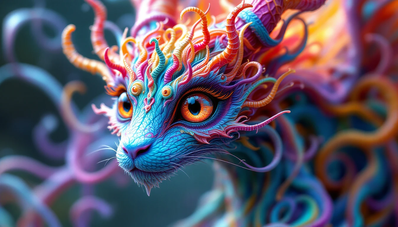 close up dof render of a winged mythical creature made of detailed spiraling fractals and tendrils, detailed recursive skin texture with rainbow colors. big round sweet eyes