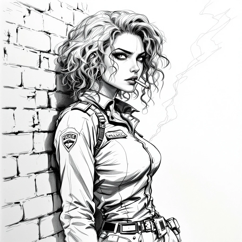A very well done pencil sketch of a cyberpunk female character, around the age of 20 leaning against a brick wall smoking a cigarette and looking away from the camera. They have an angry face. They should be wearing a police outfit and their hair is reminiscent of makima from Chainsaw man, but curly hair.