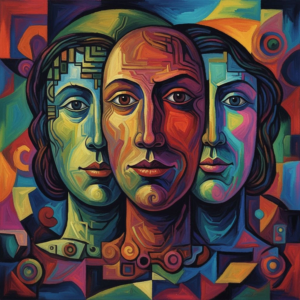 In the style of three faces inside of one head by Pablo Picasso, extremely detailed colorful digital paint, paint stoke colors, beautiful colorful 3D painting strokes, masterpiece, dynamic colors, dynamic abstract expressionism, no noise, elegant.