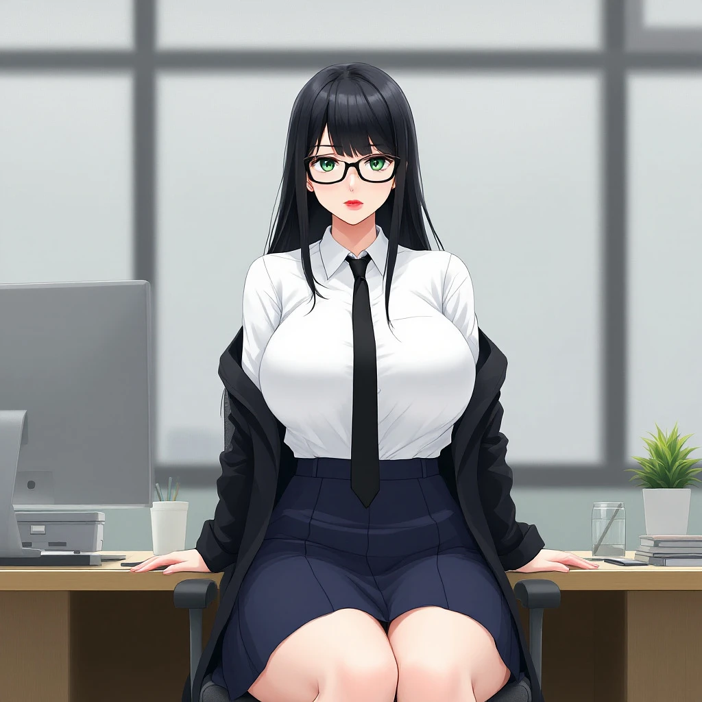 anime, woman, black hair, long hair, green eyes, black glasses, red lips, white shirt, black tie, black blazers, short dark blue skirt, highschool skirt, white long socks, black shoes, standing at an office, bored expression, big chest, sitting on a chair, sitting with legs crossed