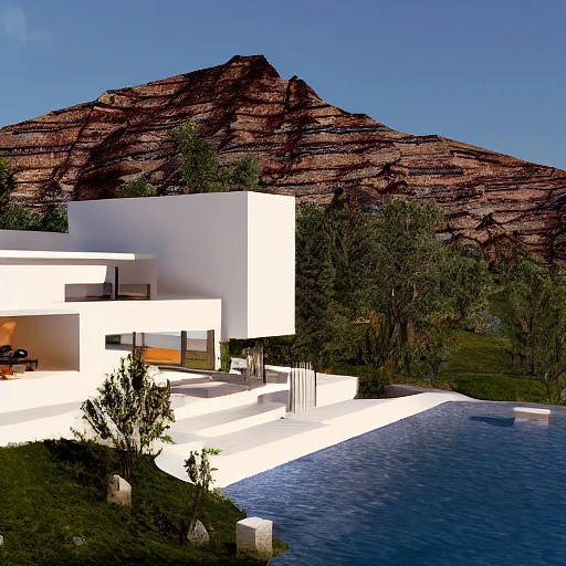 < Realistic architectural rendering, interior, sunken living room, large fire place, single-family home: white, modern, angular design, high on a steep cliff, in the desert of the American Southwest, stylish, generative design, warm color tones, realistic, cinematic, unreal engine, 8K, HD, full sun