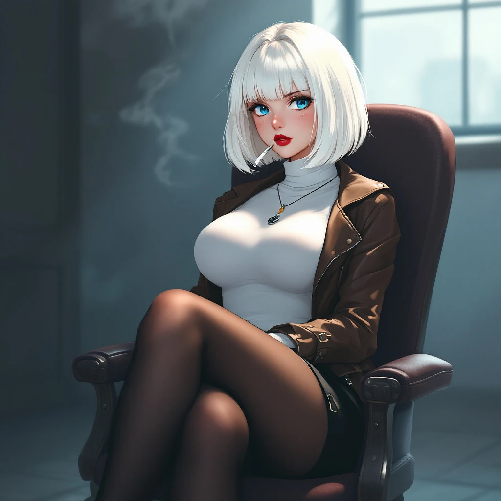 anime, woman, white hair, bob cut, blue eyes, freckles, red lips, white sweater, tight sweater, short leather jacket, brown leather jacket, black tight skirt, black stockings with straps, black high heels, bored expression, sitting on a chair, sitting with legs crossed, big chest, smoking a cigarette