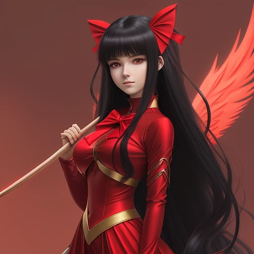 An anime beautiful woman holding a new-age bow in a red outfit, she has dark long hair, her face has cat-like features, and she has a tail and angel wings