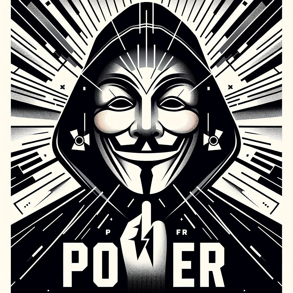 Design a movie poster for "P for Power, " featuring the V for Vendetta mask in a powerful and dynamic graphic style. Use geometric shapes and clean lines to create a striking contrast with the mask, while incorporating design elements that represent the strength and power of individuals and communities.