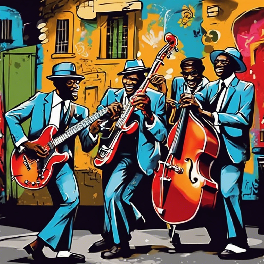 60s jazz band, black folk dancing in Havana night club, street art graffiti style