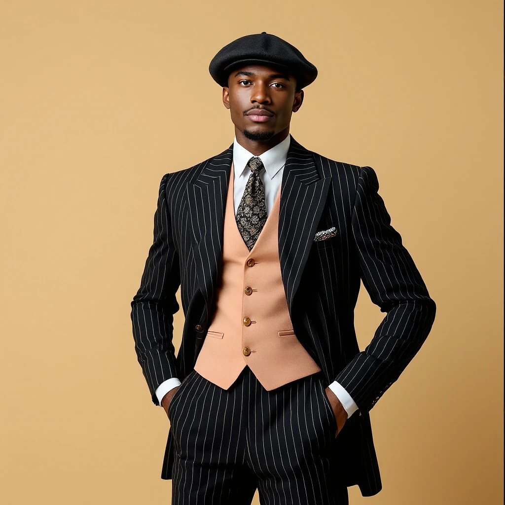 a wide angle shoot of A young afro American man dressed in a dark pinstripe suit with wide lapels, a contrasting light peach-colored vest, a white collared shirt, and a patterned tie, topped with a dark beret, will be posing confidently with his hands on his belt. He will be standing on a seamless light beige backdrop. The lighting will be somewhat flat and diffused, typical of the era. retro aesthetic.